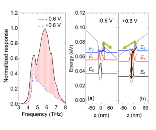 太赫兹量子阱探测器具有响应速度快、探测灵敏度高的优点,其探测机理是利用束缚电子吸收太赫兹光子,在半导体量子阱中子能带间跃迁,改变器件的电导率,从而实现对太赫兹辐射的探测。张桂雪同学与导师团队采用非对称阶梯量子阱结构,打破了子带跃迁选择定则的限制,大幅度提高了探测带宽。同时,团队还发现了该探测器的太赫兹响应谱与偏压极性相关。通过理论计算表明,这种偏压极性相关太赫兹响应谱来源于阶梯量子阱中波函数的不对称性,这为设计新型太赫兹量子器件提供了新的手段。该成果是在太阳官网高水平学科项目资助下取得。