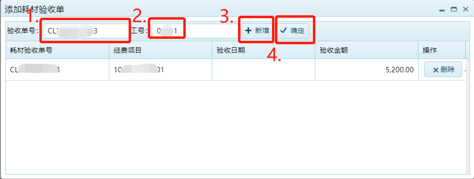 3.输入“验收单号”、申请人“工号”,点击“新增”;系统将自动带出:“材料验收单号、经费项目、验收金额”;点击确认即可。