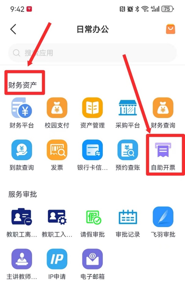登录信息门户,点击“财务资产”“+”,进入应用中心页面,选择“自助开票平台”;移动端Welink中,搜索 “自助开票”,或进入日常办公,在“财务资产” 中,点击“自助开票” 。